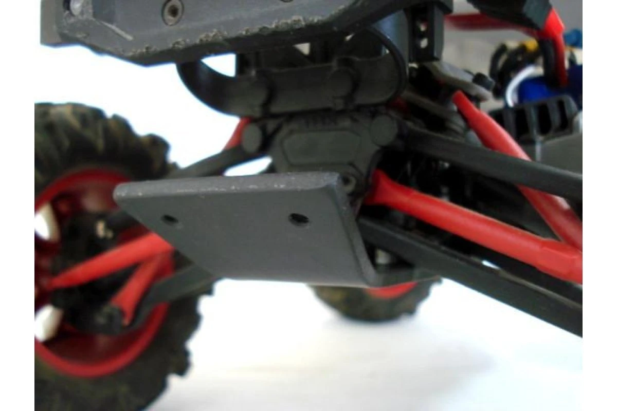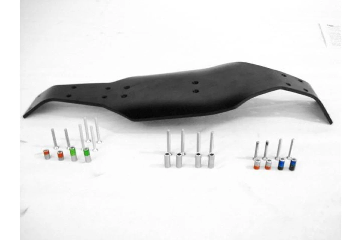 T-Bone Racing chassis brace for the 1/16 Summit is made of .125″ black nylon and weighs 2.5 ozs. It is mounted with 12 screws to spread the impact accross the whole lenght of your chassis. We use aluminum spacers to mount between the stock skid/chassis and our brace, providing clearance for the A-Arms. The brace comes with 3 holes front and rear to mount the bumpers (not included) If you already have a T-Bone front Thrasher and rear Monster, you can modifiy them to bolt on to the chassis. A dremel tool will work fine.Does not come with front and rear bolt on bumpers and uses a different mounting bracket than the 1/16 E-Revo.